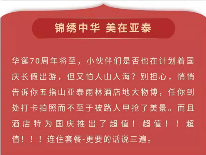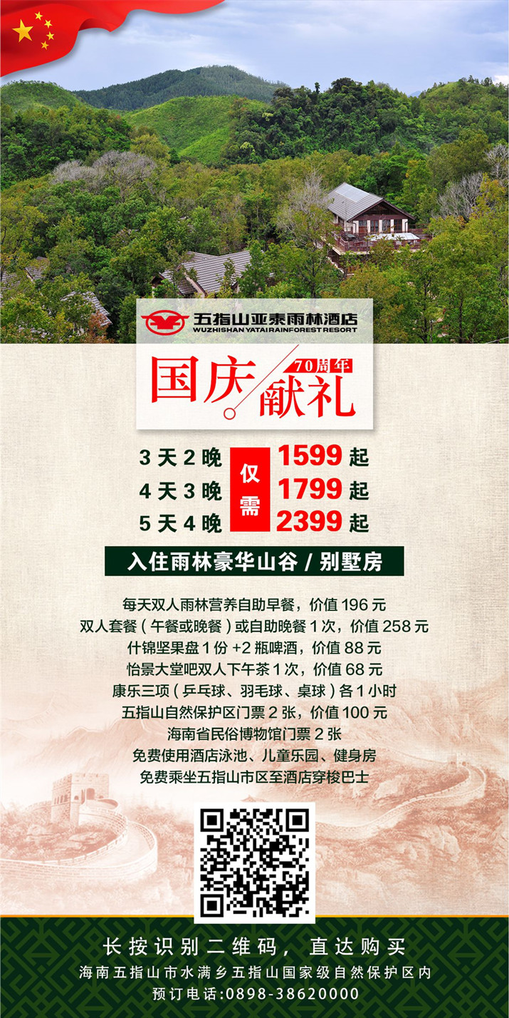 【五指山亚泰】国庆巨献-连住套餐3天2晚仅1599起