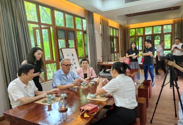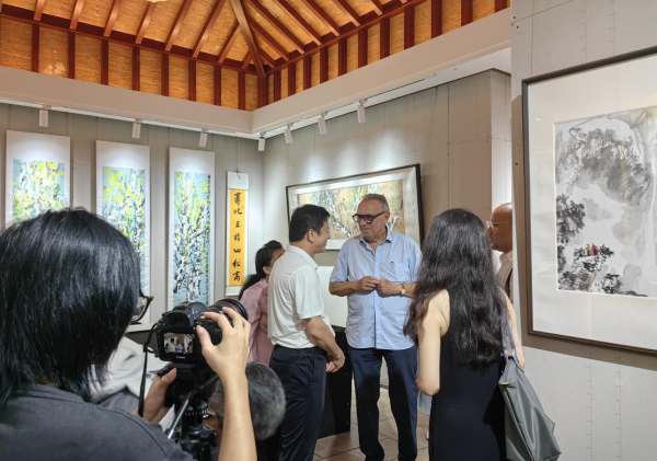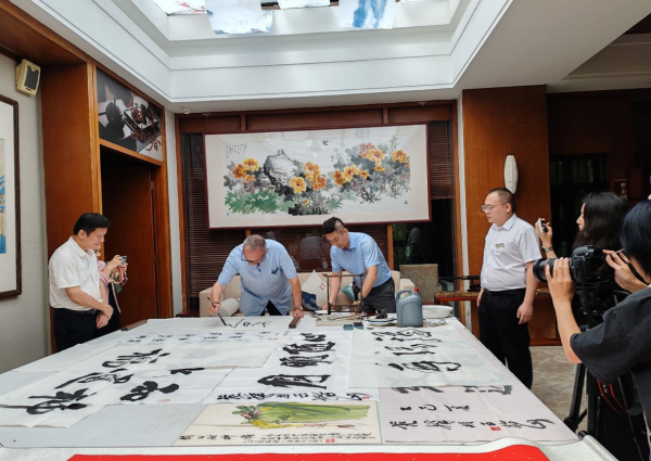 随后,嘉宾一行参观了范桦艺术馆,欣赏馆内水墨丹青画作并提笔留 下墨宝,感受中国传统书画艺术中所蕴涵的自然哲学与人文意境。胡安先 生表现出浓厚的兴趣,并就艺术与旅游融合发展与在场人员交流意见。