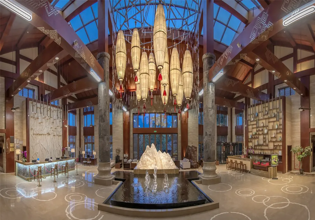 酒店占地143亩,建筑巧妙地融合了东南亚风情与传统的黎族船型屋、吊脚楼元素,大力神、蛙纹等黎苗图腾点缀其间,让建筑 本身就成为了一道文化风景线 。